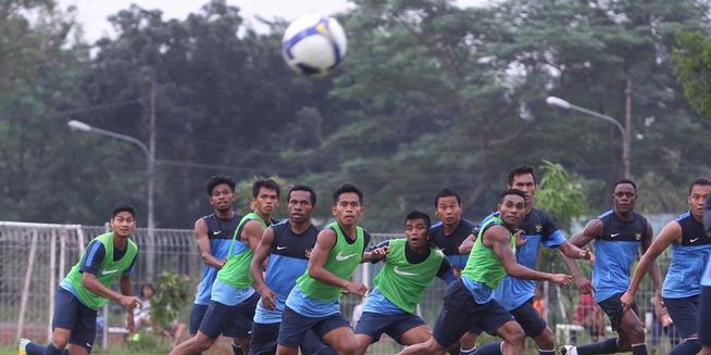 Pemain tim nasional Indonesia merespons tendangan bebas saat berlatih di Lapangan Sutasoma 77 Kompleks Pangkalan TNI AU Halim Perdana Kusuma, Jakarta, Kamis (21/3/2013). Timnas terus memantabkan strategi untuk menghadapi Arab Saudi dalam laga Pra-Piala Asia Australia 2015 di Jakarta, 23 Maret mendatang.